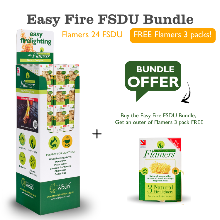 - Bundle Content: Easy fire FSDU bundle includes 4 outer boxes of Flamers 24-packs (192 boxes), plus 1 FREE outer box of Flamers 3-packs (72 boxes), supplied with a retail-ready freestanding display unit.
